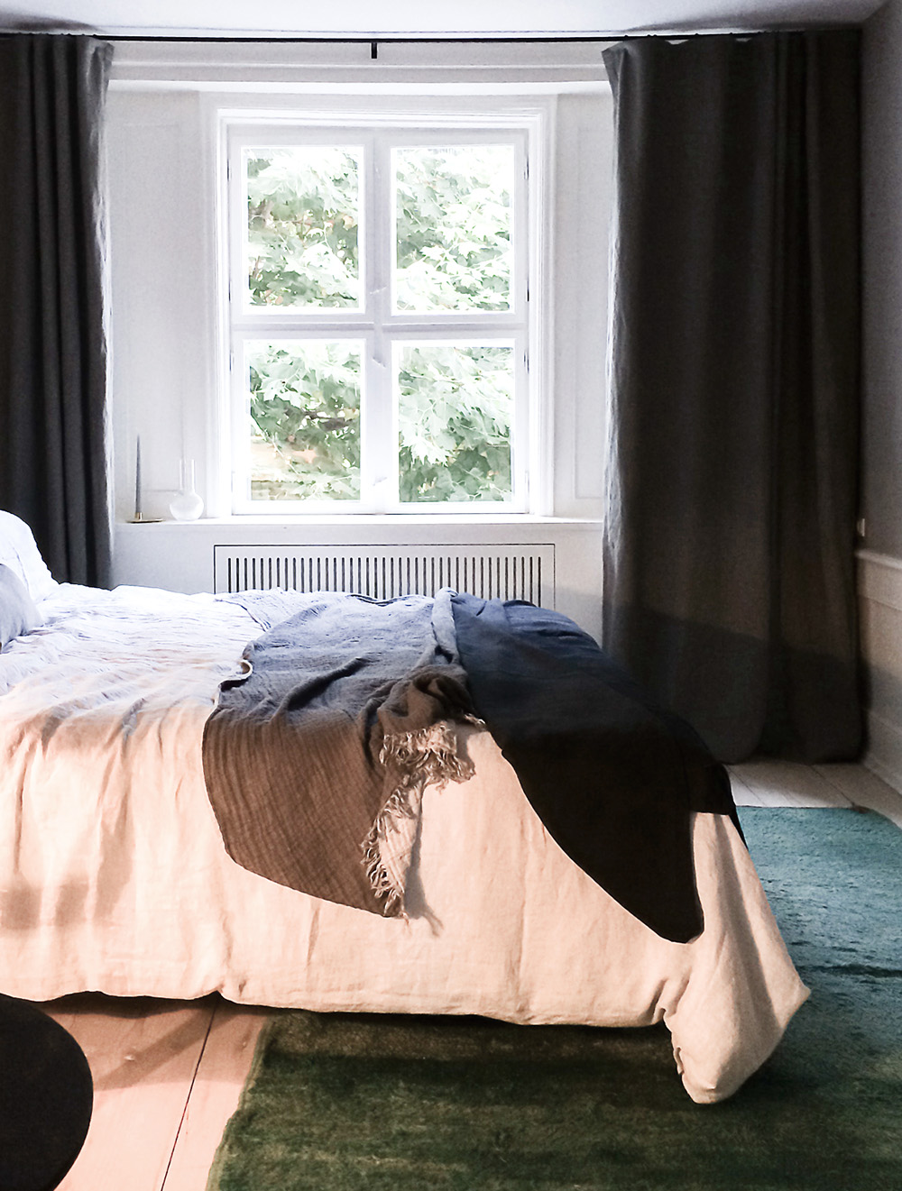 The Apartment in Copenhagen designed by Ilse Crawford and her team at Studioilse has a wonderful ambience. Muted wall colors and furniture blends perfectly with well chosen materials in the furnishing, mixing natural fibers and brass, dark wood with pale wood. Thick rugs on the beautiful wooden floors, sheep skins on armchairs, a lovely throw lying casually on the bed and books piled on coffee tables and in bookcases, create a homely but stylish wholeness.
