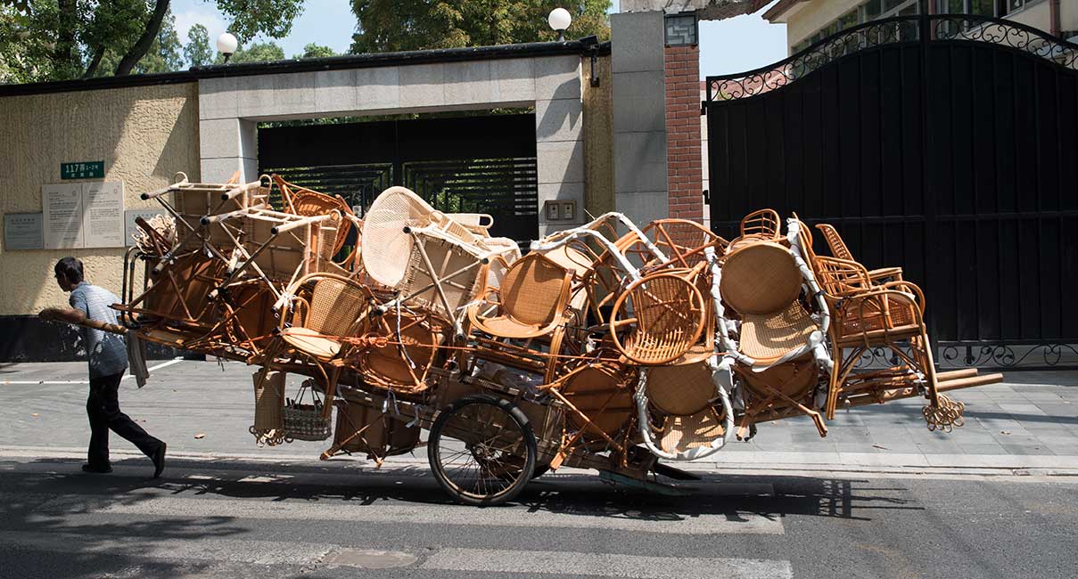 rattanShiny, new cars and man drawn carts, filled to the brim with rattan furniture.