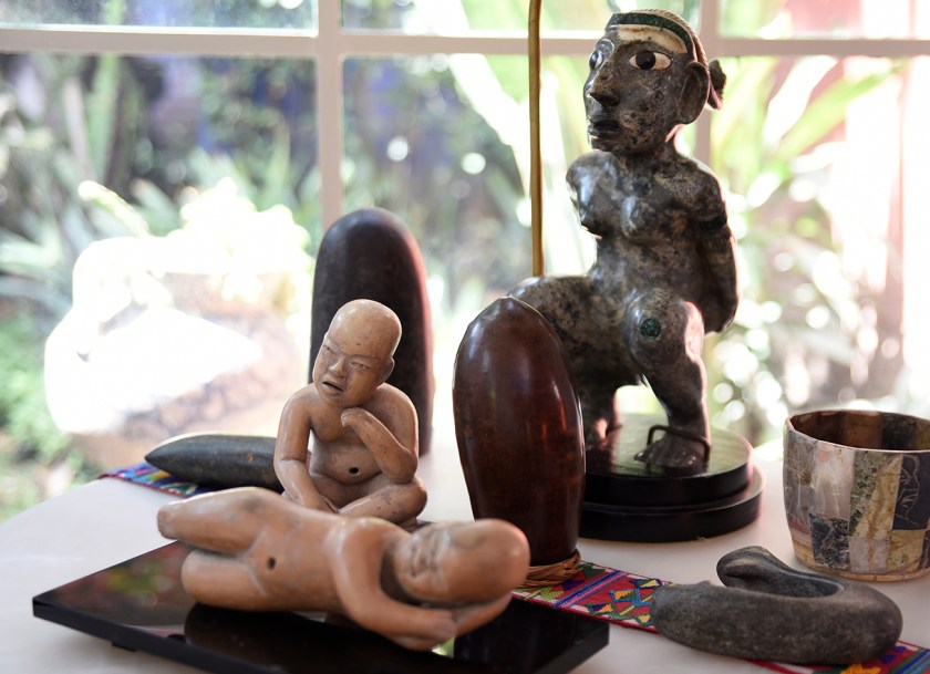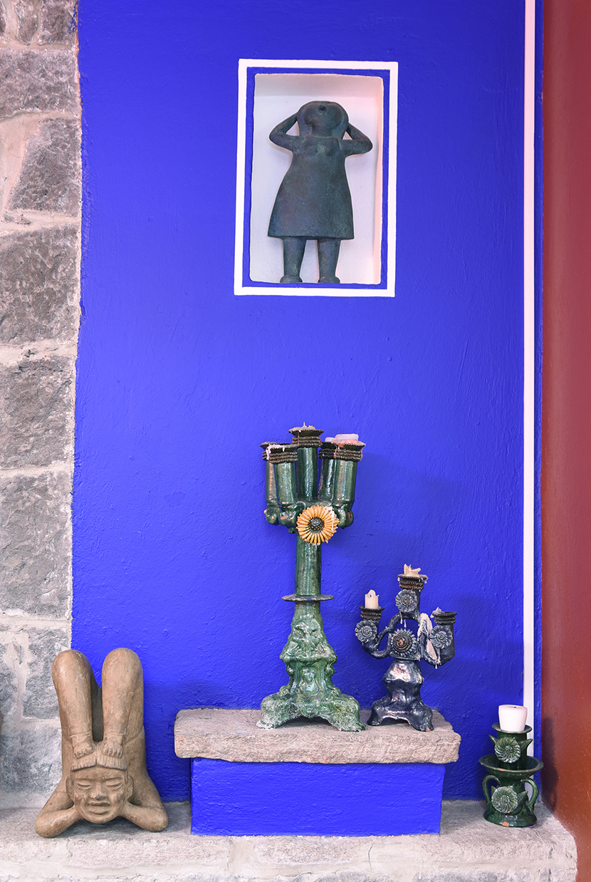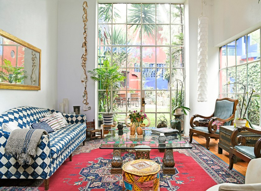 The living room has a ceiling height of nearly six metres. It has a stunning floor-to-ceiling window that takes in the greenery of the garden and the adjoining blocks of blood red and cobalt blue on the different parts of the buildings that make up the house. This large room was built on the existing house and where Juan O’Gorman had his studio. And it’s here that Paulina spends the most of her time.