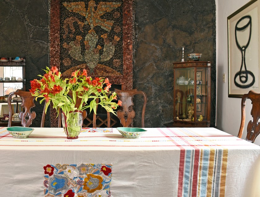 Paulina lives in the former home of Juan O’Gorman, the Irish/Mexican artist and architect, famous for his murals and mosaics. His most well known work is the UNAM University Library of Mexico City, and the Bank of Mexico. The façade of the Library is covered in mosaics of natural stones with motifs of the Mexican people’s history. Very different are the houses he designed for his friends, Diego Rivera and Frida Kahlo, just two streets away. These buildings, from 1933, are in a functionalist style people called brutalist-functionalism at the time. They were the very first of their kind in the city and were very controversial. He had first designed and built this very house in the same functionalist style, originally for his father but it was later to become his own home.