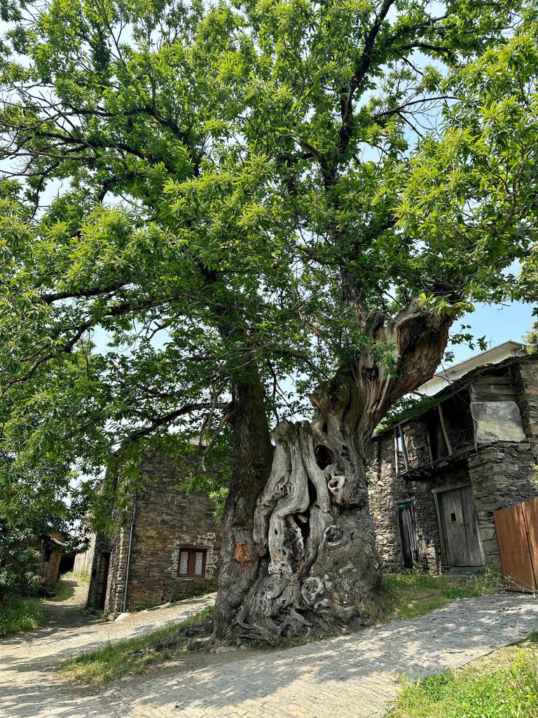 Just before Tricastela I pass the famous centennial chestnut tree of Ramil, 850 years old, according to data provided by the Superior School of Rural Engineering of Madrid. Over eight centuries are reflected in its almost nine meters in perimeter, I read. Yes, it’s a handsome old tree, and it’s impossible to walk past without taking a photo of it, standing as it is right on the path, as if to welcome pilgrims on their arrival at Tricastela.