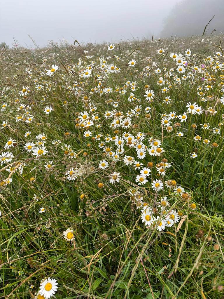 Good thing for me that I can refocus on the beauty around me, because everything has a magical feeling when shrouded in fog. It’s a steep climb to Alto do Poio, but once up there the view is magnificent! We are above the clouds up here and mountain peaks rise like floating islands. There is a café here and I have a large glass of freshly pressed orange juice and a tortilla for brunch, and I’m as good as new and ready to go.